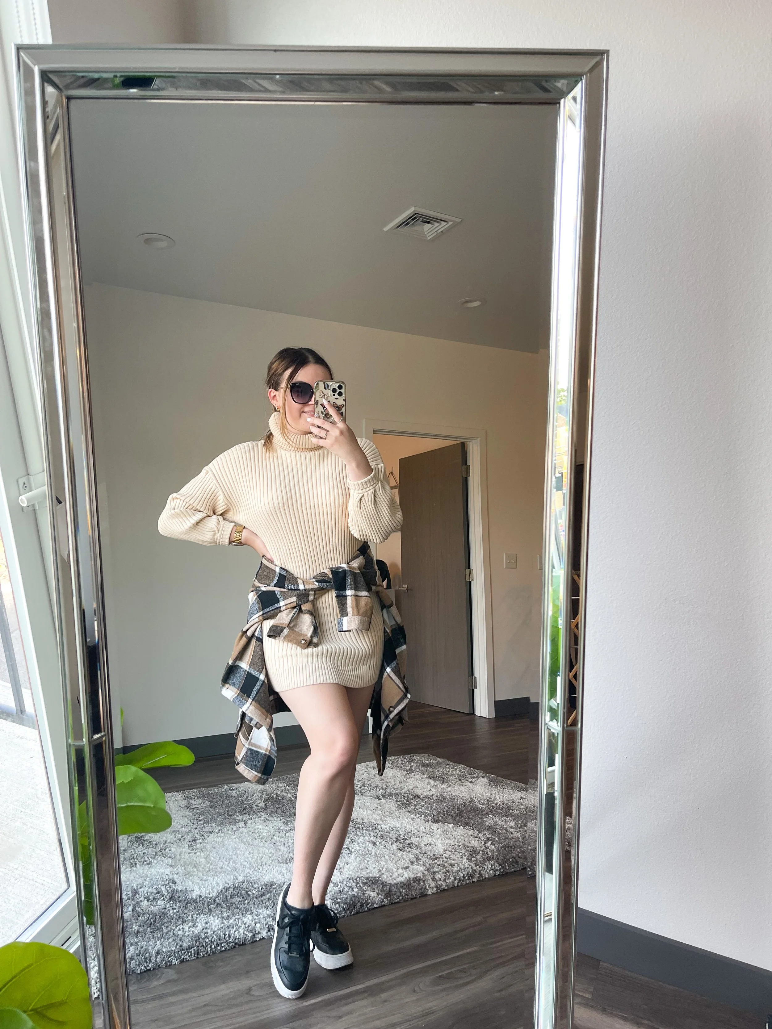 This garment was accidentally sent to me but I oddly love it! I ideally would have done a L if I purchased it myself but M works if you are more on the petite side. Regardless I really like dresses like this for the fall, I find them to be rather versatile and easy to wear with flannels, boots or sneakers. As temperatures continue to dip, consider a pair of nude sheer tights underneath. It’ll keep you warm and add a nice texture to the overall fit!